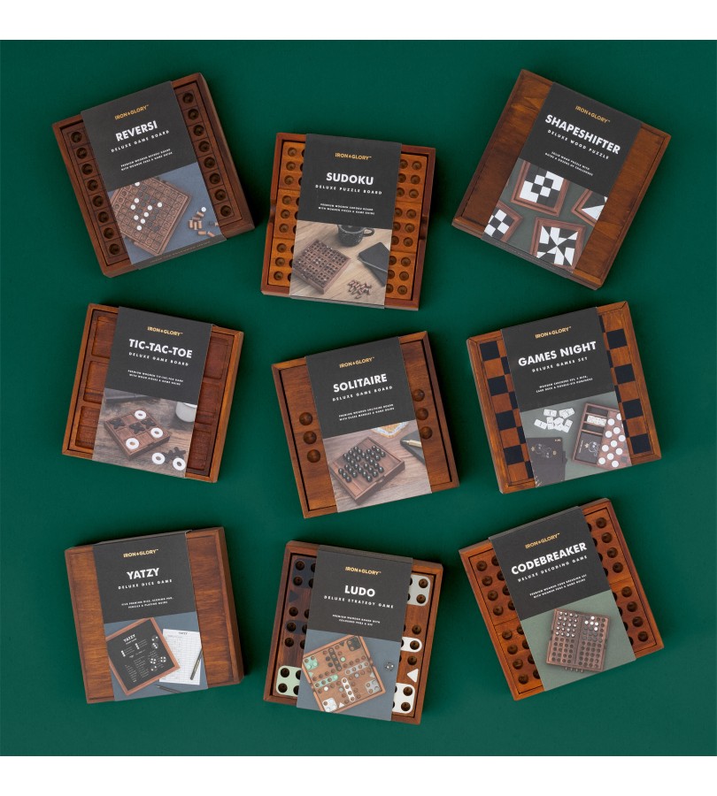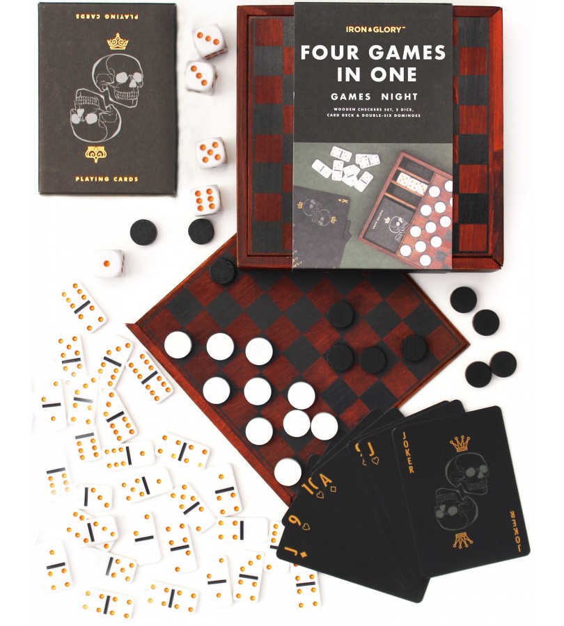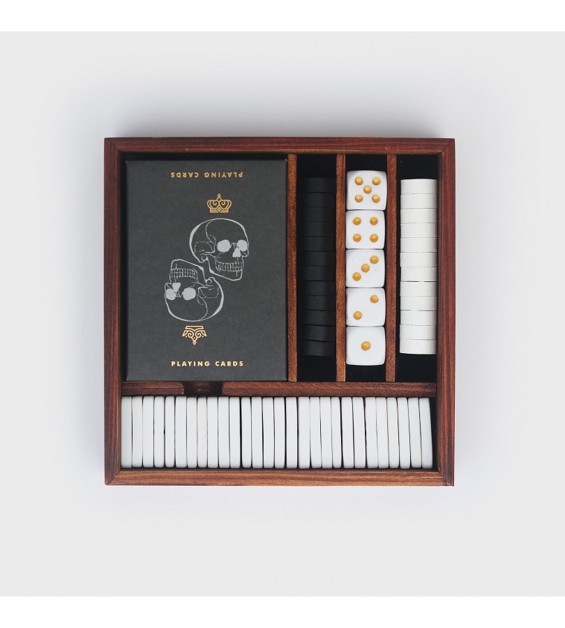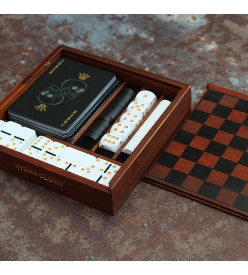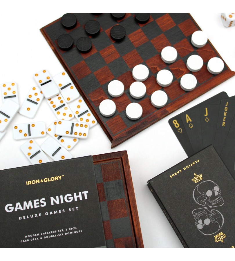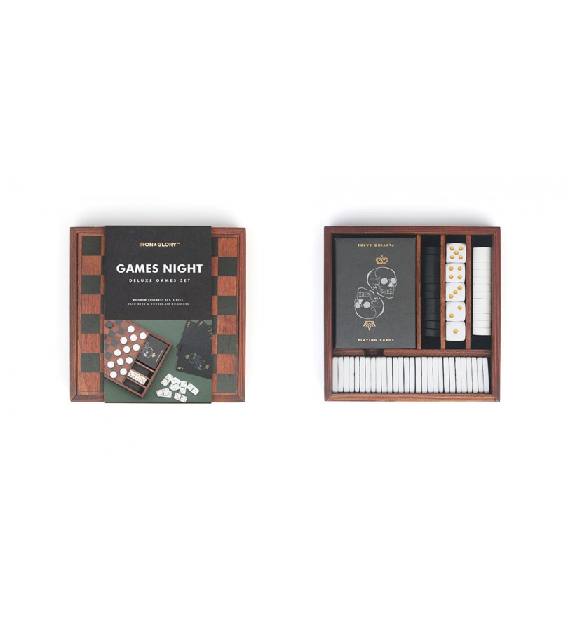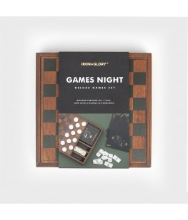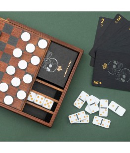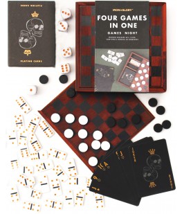 Um compêndio clássico de jogos para aquelas grandes noites em casa. Junta os teus amigos, abre umas bebidas e mergulha em jogos à moda antiga. Tens tudo o que precisas numa só caixa: dados, cartas, damas, dominó — e a tampa da caixa funciona como tabuleiro.
