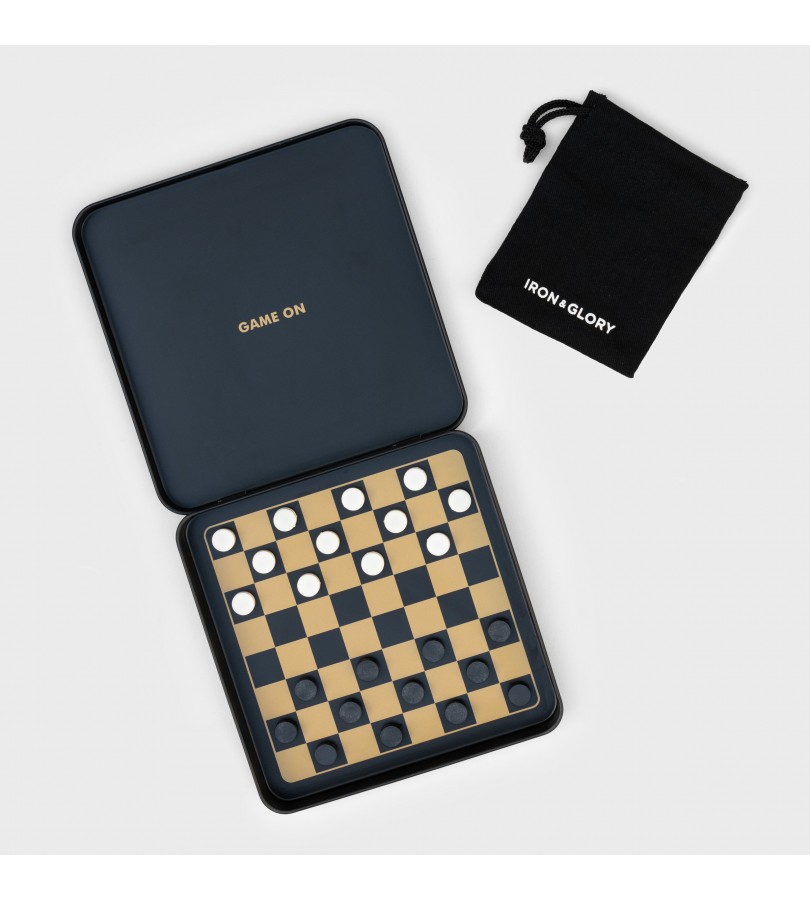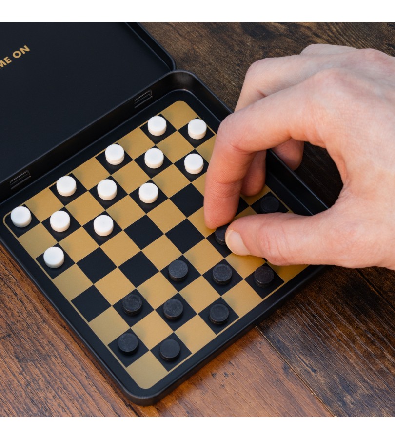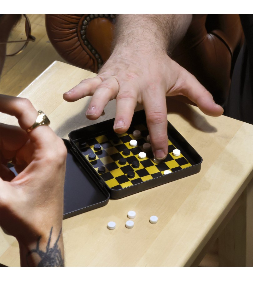 As damas são exercício para o cérebro e um passatempo divertido. As nossas peças magnéticas vêm numa bolsa de veludo, e a própria lata serve de tabuleiro — por isso não ocupas espaço precioso na tua mochila. Põe-te a jogar.