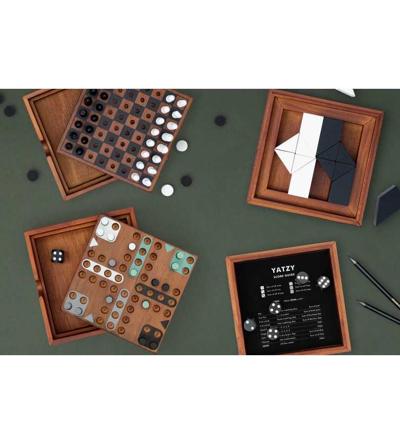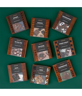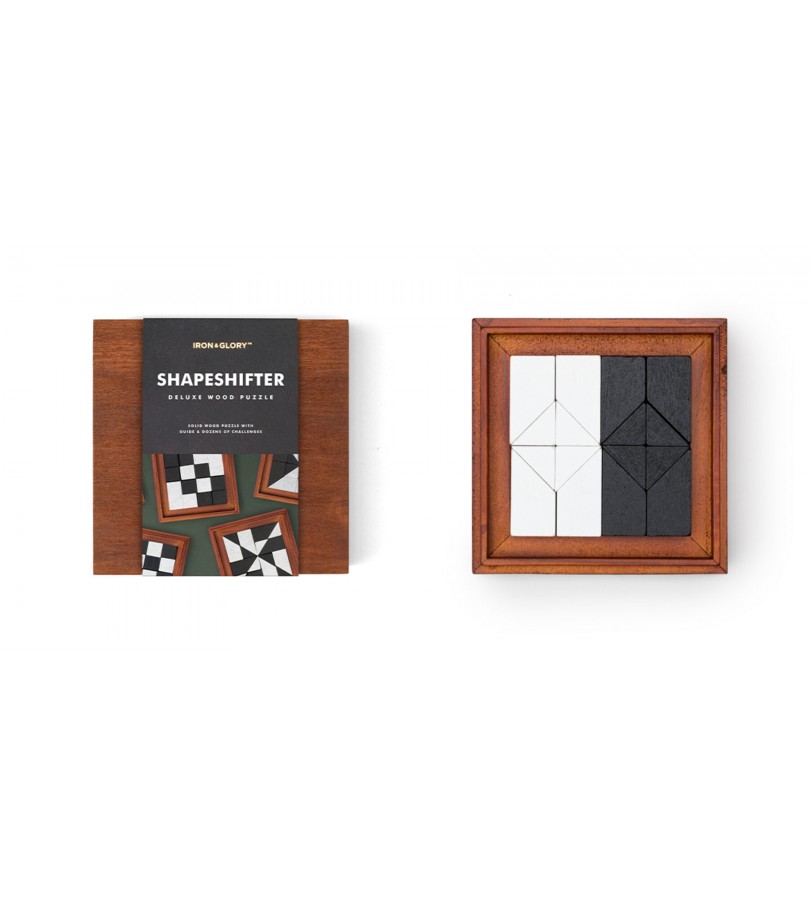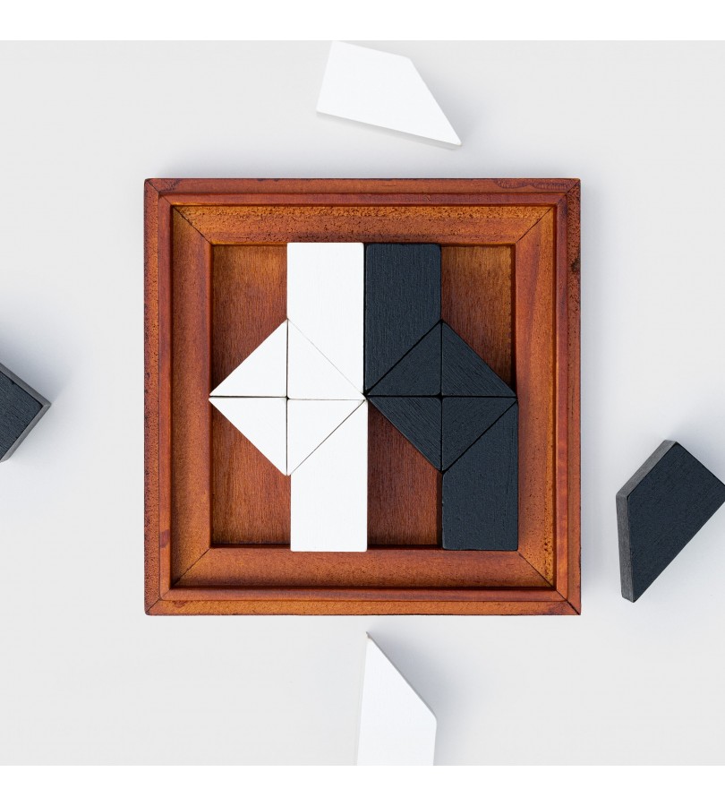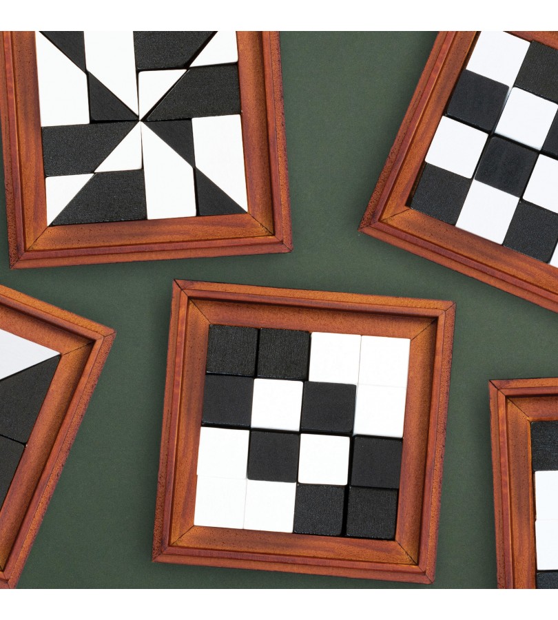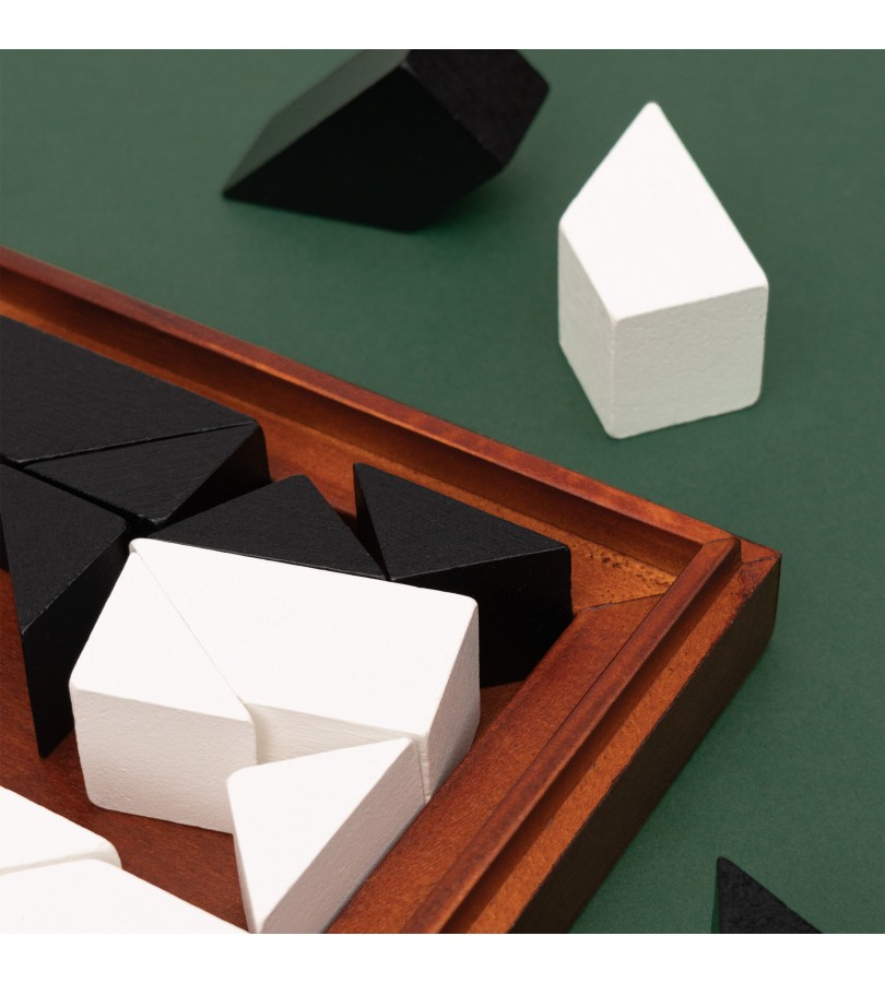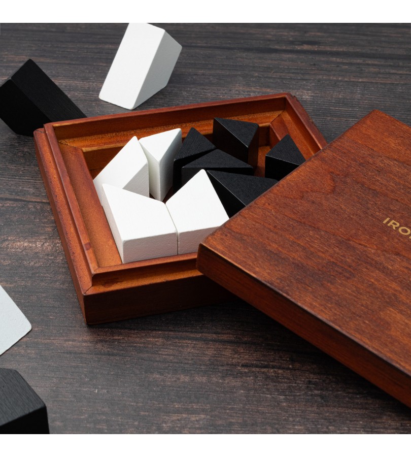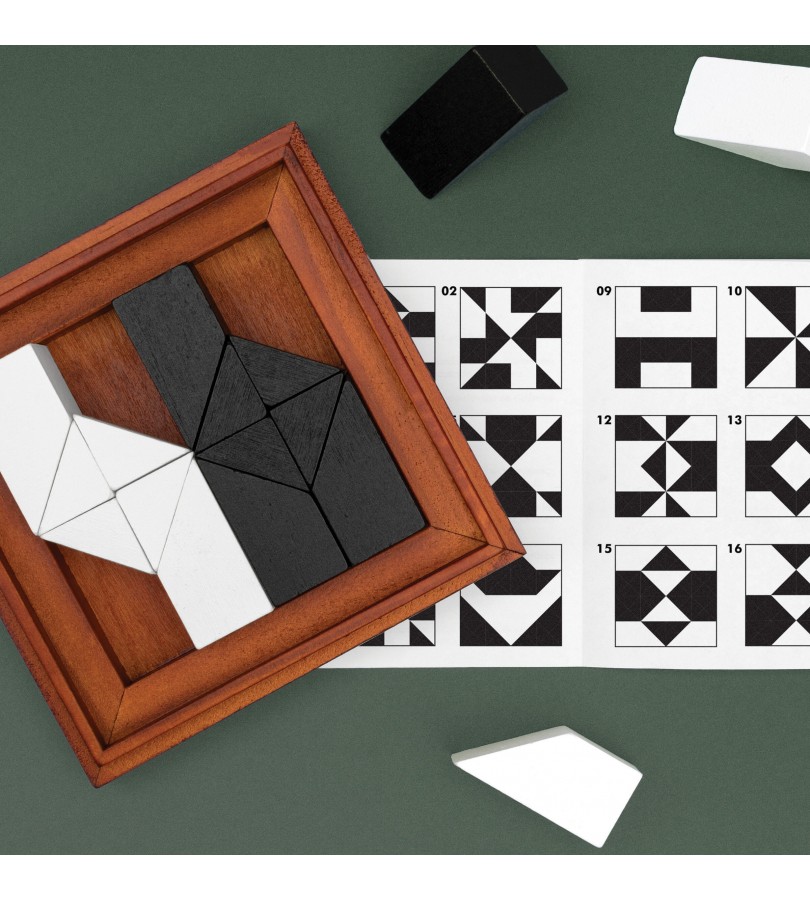 Este conjunto deluxe inclui 16 peças abstratas em madeira a preto e branco, e vem com instruções sobre como jogar, puzzles para resolver e as respetivas soluções.