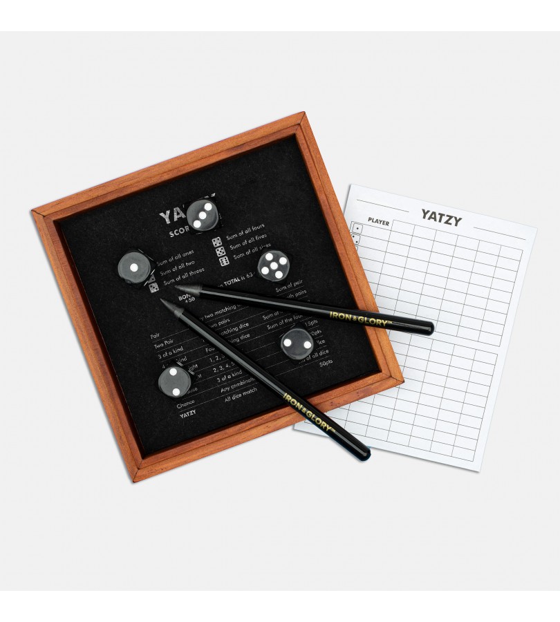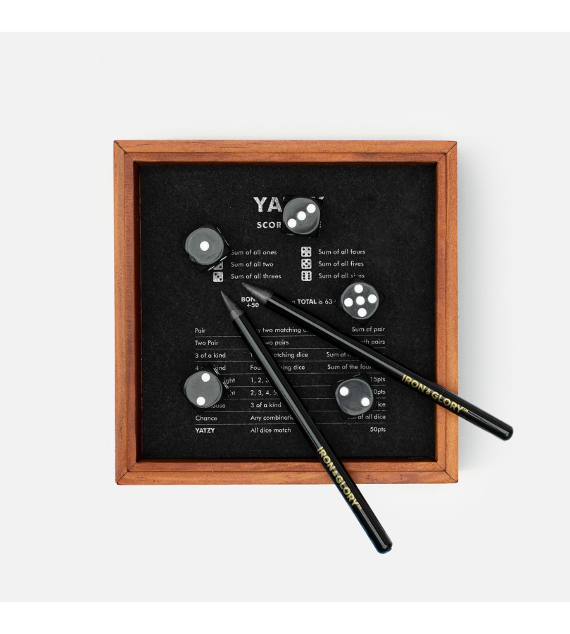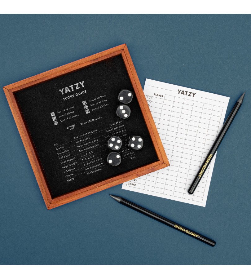 Este jogo deluxe inclui dados, cartões de pontuação e lápis — tudo num só design. A própria caixa funciona como arena para lançar os dados. Forrada a feltro, com táticas de pontuação impressas para referência rápida. Um favorito da família.